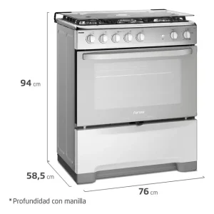 Además, incluye un grill eléctrico para dorar y gratinar, encendido electrónico para mayor seguridad y comodidad, y un sistema de seguridad tanto en quemadores como en horno. Su eficiencia energética está certificada con clasificación A, lo que garantiza un consumo responsable de gas licuado o gas natural. Es un producto fabricado en Chile, con una vida útil estimada de hasta 15 años.